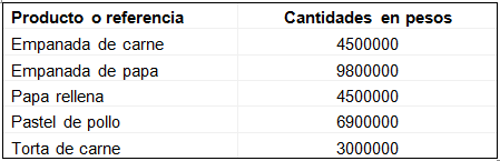 Si se asume que las ganancias son del 30% respecto a las ventas, entonces el costo total de cada referencia sería el 70% de dichas ventas. Para las empanadas de carne sería: