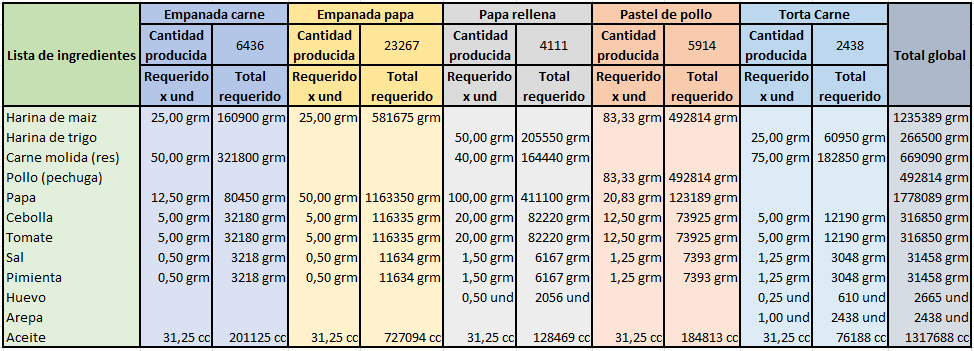 Para el nivel de ventas dado, se produjeron 6436 empandas de carne. De manera similar se hace para el resto de referencias: